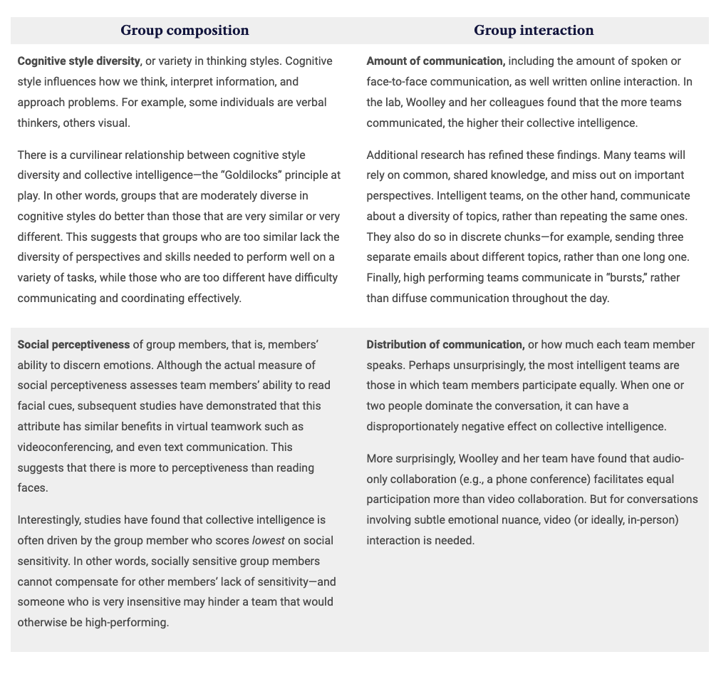 If IQ isn’t the source of collective intelligence, then what is? To date, Dr. Woolley and her colleagues have identified four main drivers of collective intelligence, which fall into two categories: group composition and group interaction.
